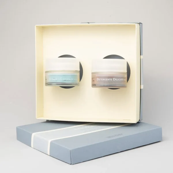 Il kit gesti essenziali è il rituale quotidiano fondamentale per mantenere la pelle pulita, luminosa e ricettiva ai trattamenti. Include un burro detergente cremoso e uno scrub-gommage in crema, pensati per detergere in profondità e favorire il naturale rinnovamento cellulare della pelle